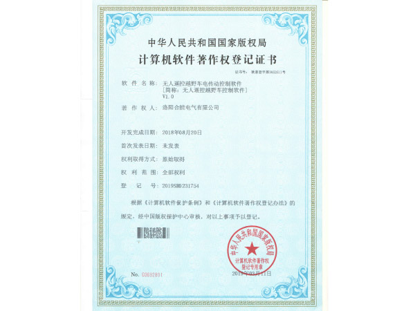 無人遙控越野車電傳動控制軟件著作權登記證書